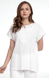 All White but colorful. Colorful but all White. It’s what this top is. Trimmed with machine made laces on the collar, hem and armholes, embroidered with colorful flowers on the bust, this top can be combined easily with your skirts and trousers